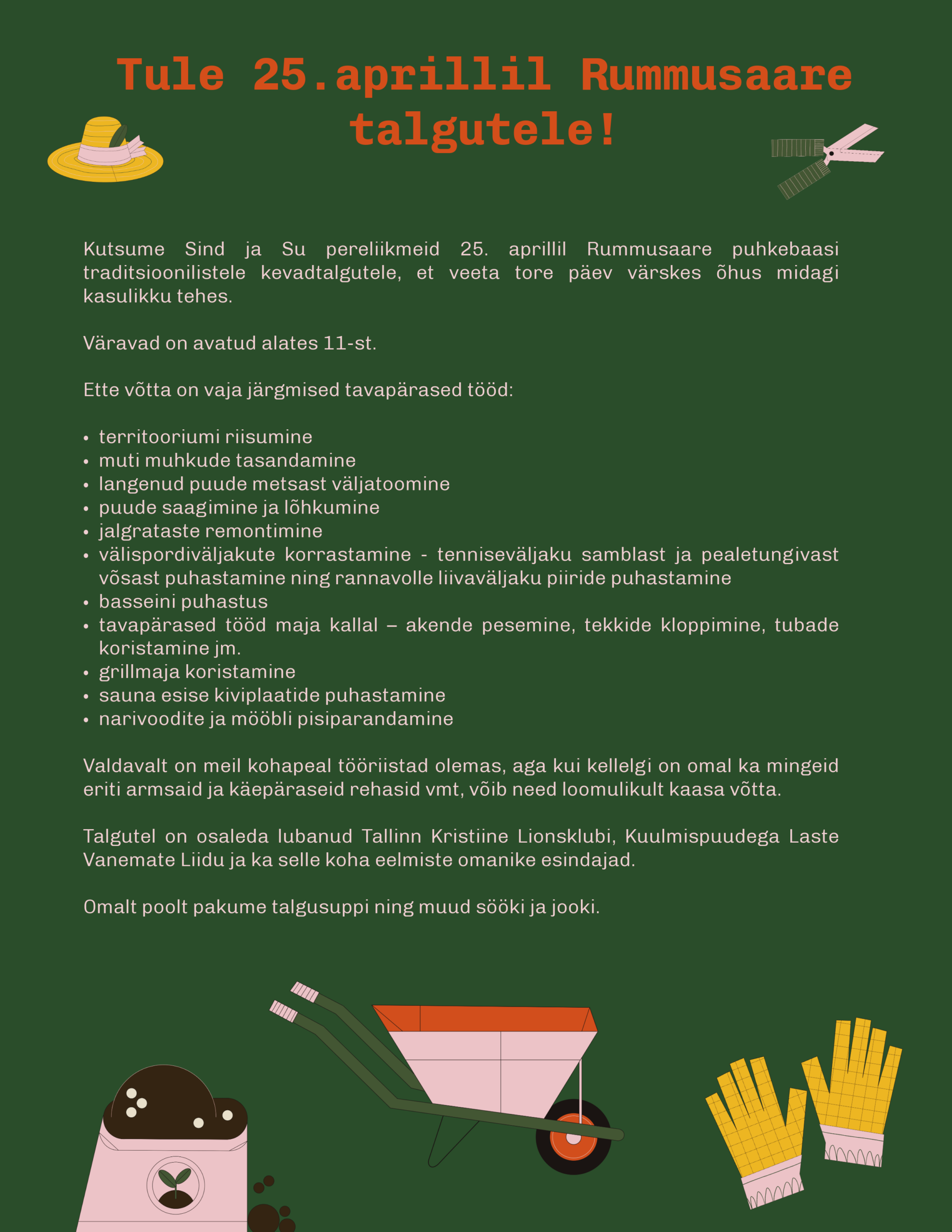 Osalejatel palun oma tulekust hiljemalt 22. aprilliks teada anda, et saaksime kõik tulijad ilusti leivale võtta ja oma töid planeerida. Siin saab talgutele registreerida.